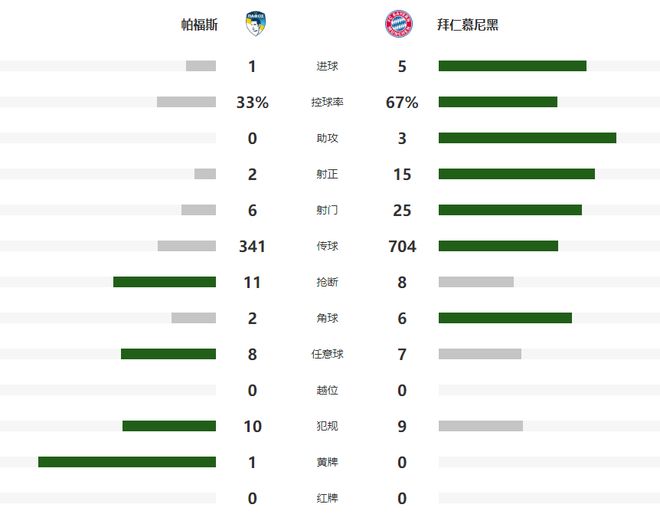 易边再战,拜仁继续给帕福斯的后防施压,第59分钟杀到前场的帕夫洛维奇一脚势大力沉的远射,被主队门将奋勇挡出,随后基米希获得了头球顶空门的机会,可惜面对破门良机没有把握住,错失进一步扩大优势的良机。第69分钟南大王再次撕开了主队的球门,基米希的直塞,给杰克逊创造出了单刀机会,虽然他的射门被封堵,但奥利塞拍马赶到补射建功,将全场比分定格为了5-1。