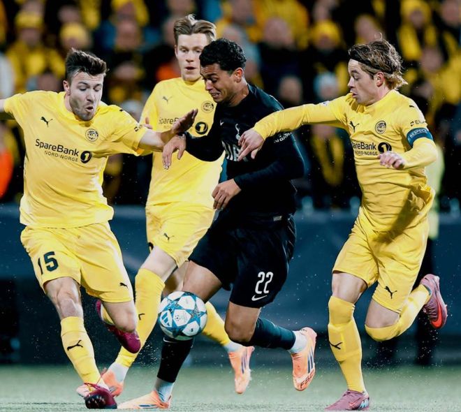 欧冠联赛阶段第2轮的一场比赛展开争夺,热刺做客挑战博德闪耀。热刺在联赛取得3胜2平1负的成绩,排名第4,只比榜首的利物浦少4个积分。近2场联赛热刺都没有赢,接连战平布莱顿和狼队。这次热刺来到欧冠赛场,面对的是总身价只有6073万欧元的挪超球队博德闪耀。结果让人意外,热刺在2球落后的情况下逼平了博德闪耀,拿到1分!本场比赛热刺排出433阵型。奥多贝尔、里沙立松和布伦南-约翰逊的进攻三叉戟联袂出击。萨尔、本坦库尔和贝里瓦尔组成3中场。斯彭斯、范德芬、凯文-丹索和波罗4后卫首发出战。维卡里奥担任首发门将。库杜斯和哈维-西蒙斯坐在替补席待命。比赛刚开始不久,贝格在禁区外来一脚超远距离射门。踢得有点正,但力量有点大,门将不敢怠慢把球扑了出去。主场作战的博德闪耀踢得更加犀利,接连创造出机会。第24分钟,海于格在禁区中路的射门被身前的防守球员挡了出去。5分钟后,布伦南在禁区线上凌空抽射,结果踢飞了,皮球直奔观众席。第33分钟,布约尔坎在禁区内被放倒,裁判判罚点球。卡斯帕-霍主罚点球,结果他罚出的点球踢飞了。这样的好机会浪费掉太可惜了。热刺逃过一劫。第44分钟,萨尔在禁区外尝试一脚低射,打远角,踢偏了。半场结束,热刺0-0博德闪耀。下半场易边再战。第53分钟,场上的僵局终于被打破。埃夫连把球分给海于格。海于格带球内切兜射远角,皮球应声入网!热刺落后了!紧接着,本坦库尔进球了!但是,因为队友犯规在先,进球无效。第60分钟,热刺进行换人调整,哈维-西蒙斯和库杜斯替补上场。第66分钟,博德闪耀再次进球!依然是埃夫连助攻海于格。海于格扣球过人后劲射破门,完成梅开二度!3分钟后,热刺扳回一球。波罗起球传中,范德芬抢点头球攻门,球进了!第89分钟,甘德森犯下大错,乌龙球送礼,拯救了热刺。最终,热刺2-2战平博德闪耀!25岁天才海于格无疑是全场最佳,他梅开二度踢爆热刺。
