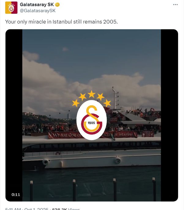 雷速体育10月1日讯 欧冠联赛阶段次轮,加拉塔萨雷主场以1-0力克利物浦,爆出本轮的一大冷门。加拉塔萨雷在获得这场胜利后,也不忘调侃利物浦,但最受伤的却是米兰哥。加拉塔萨雷在主场以1-0力克英超领头羊利物浦,这也爆出了一大冷门!在比赛结束后,加拉塔萨雷队在社媒上,也对利物浦进行调侃:“在伊斯坦布尔的比赛里,你们唯一的奇迹仍然是在2005年。”2004-05赛季欧冠决赛,便是在伊斯坦布尔进行,那场比赛的对阵双方是利物浦和AC米兰。在这场比赛里,利物浦在上半时0-3落后的情况下,下半时6分钟进3球,将比分追成3-3,并且在点球大战击败米兰夺冠。这也是欧冠史上最不可思议的一幕,被乘坐“伊斯坦布尔奇迹。”
