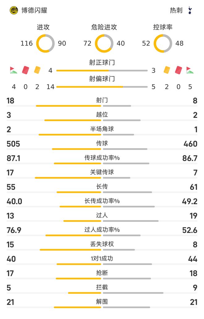 雷速体育10月1日讯 25-26赛季欧冠联赛阶段第2轮,挪超球队博德闪耀坐镇主场2-2战平英超球队热刺。此役,海于格梅开二度,热刺则凭借范德芬的进球及冈德森的乌龙球追平比分。控球率方面,双方呈现势均力敌之势,博德闪耀控球率52%,热刺控球率48%。进攻次数上,博德闪耀116次,热刺90次。危险进攻次数方面,博德闪耀72次,热刺40次。角球数据,博德闪耀4次,热刺则5次。传球数据方面,博德闪耀全场505次传球,传球成功率87.1%,其中关键传球达17次。反观热刺全场460次传球,传球成功率86.7%,关键传球仅为7次。射门数据方面,博德闪耀全场18次射门,其中4次射正;至于热刺全场8次射门,其中3次射正。防守端数据,博德闪耀抢断17-18,拦截5-9,解围21-21。