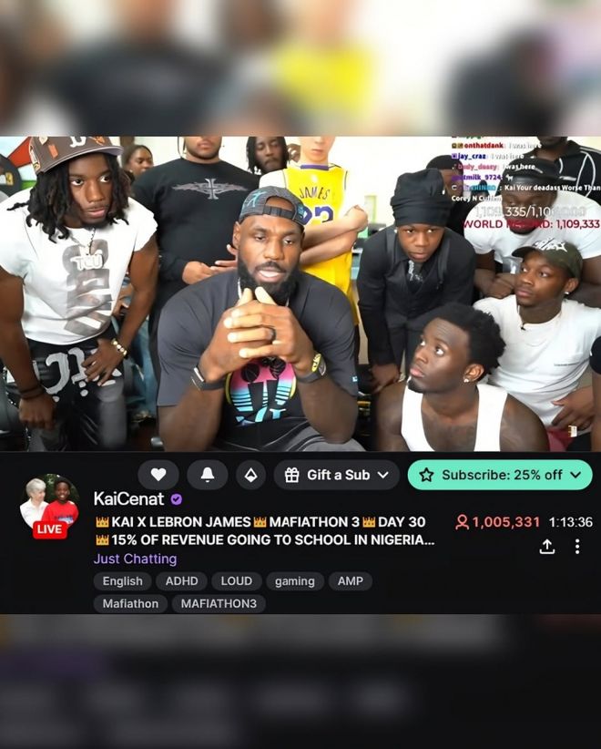 当湖人球星詹姆斯出现在网红凯 - 塞纳特(Kai Cenat)的直播间时,整个直播平台瞬间被点燃。据美国媒体 Complex 报道,这场直播的高峰观看人数直接突破 100 万人,不仅让凯 - 塞纳特实现了直播生涯首次百万在线的里程碑,更打破了他此前约 72 万观众的个人纪录,詹姆斯的 “流量号召力” 再一次得到印证。
