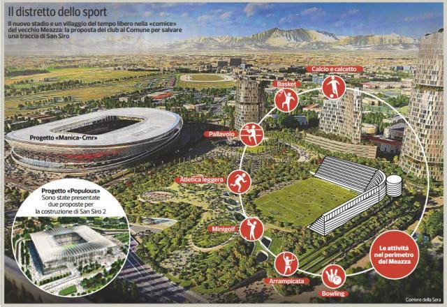 新球场蓝图1955年,圣西罗经历了一次大规模翻修,加盖了第二层看台,并呈现出如今所现的螺旋形结构,当时的建筑师阿尔曼多·隆卡不会想到,自己的项目会在近70年后的今天,以一种独特的方式影响新球场的项目计划。是的,“近”70年后。一个多月后的2025年11月10日,圣西罗二层看台的主要工程将会迎来完工70周年纪念,这意味着什么?倘若届时圣西罗依然是公共资产,它将会被纳入米兰大都会府相关机构的遗产保护名册,无法再被拆除。因此,米兰双雄和市政当局现在必须加紧日程:圣西罗球场和地皮的出售,必须要在11月10日之前完成并进行公证。接下来的40天里,两家俱乐部需要完成相关的一系列手续,并取得银行支持。如果一切顺利,米兰双雄选定的两家建筑事务所,将会开展新球场的具体设计工作。MANICA 有着丰富的体育场馆项目经验,设计过的项目包括新诺坎普和
