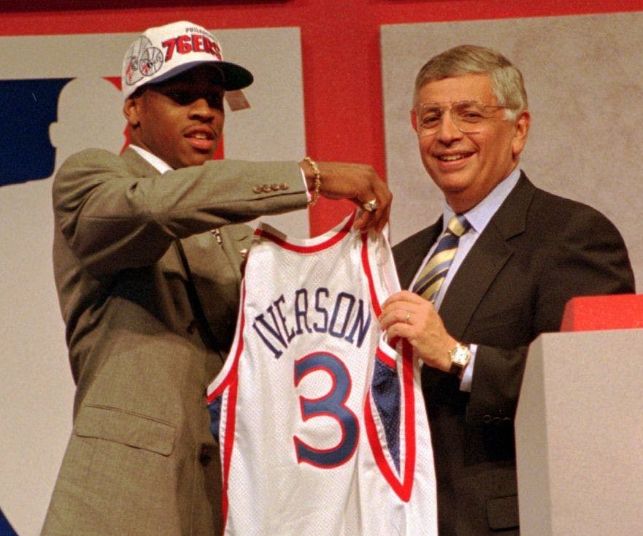 1993年2月,艾弗森因斗殴事件被捕,被指控伤人,好在最高法院和全国有色人种协进会介入后,他仅入狱四个月获得假释。也正是这段经历,让艾弗森学会了面对任何对手都无所畏惧的态度,早早埋下了日后的战神心态。出狱之后,艾弗森选择篮球作为最终归宿。1994年加入乔治城大学,首年就场均贡献20.4分4.5助攻3抢断,获选联盟最佳新秀和最佳防守球员,第二年带队拿下联盟冠军,闯入NCAA八强,入选全美最佳一阵。随后高调宣布参加1996年选秀大会。而这届选秀,也被誉为史上最强之一,诞生了无数未来名人堂球星。当时的76人握有第一个签位,球队也恰好急需一位控球天赋型基石重塑球队,自然是毫不犹豫地选中了艾弗森。