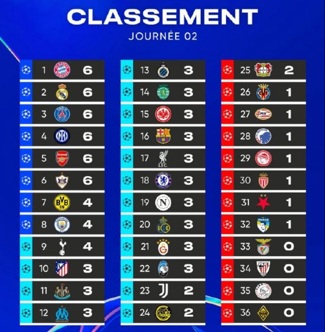 10月2日凌晨,多场欧冠比赛同时进行。至此,欧冠联赛阶段的2轮比赛全部结束。最新的积分榜上,几家欢喜几家愁。拜仁皇马等6队2连胜,而巴萨和利物浦则只有3分,药厂则位于淘汰区。前2轮,拜仁、皇马、巴黎、国米以及阿森纳这5大豪门都是豪取2连胜。其中,拜仁势头超猛,3-1击败切尔西、5-1打爆帕斯福;皇马首轮2-1小胜马赛,本轮则是5-0横扫弱旅凯拉特。巴黎在今夜2-1绝杀了,卫冕冠军依旧实力强大。要知道,巴黎队内有多位伤员,金球先生登贝莱一直缺阵,但他们依然能在客场拿下巴萨。国米前2轮分别击败了阿贾克斯以及布拉格斯拉维亚;阿森纳先后用2-0的比分击败了毕巴以及奥林匹亚科斯。值得一提的是,弱旅卡拉巴赫也迎来了2连胜,让人有点意外。首轮比赛,他们3-2绝杀了本菲卡。在这场比赛后,本菲卡立刻换帅,穆里尼奥上任。今日,卡拉巴赫又2-0掀翻哥本哈根。多特、曼城、热刺这3支队伍都是1胜1平,拿到4分,排在积分榜的7-9名。今日凌晨,曼城本有望拿下胜利,但他们在第90分钟被摩纳哥绝平,瓜迪奥拉无比郁闷。巴萨本轮被巴黎绝杀,2轮拿到1分,且净胜球为0,只能排在第16名。利物浦更悲催,今夏投资近5亿欧的红军暂时只排第17名。切尔西昨日1-0小胜本菲卡,2轮同样拿到3分,排在利物浦之后。豪门之中,勒沃库森是最悲催的。2连平之后,药厂排在第25名,正好跌出了晋级区。目前,超级弱旅凯拉特排在倒数第1名,他们前2轮一共丢了9个球。