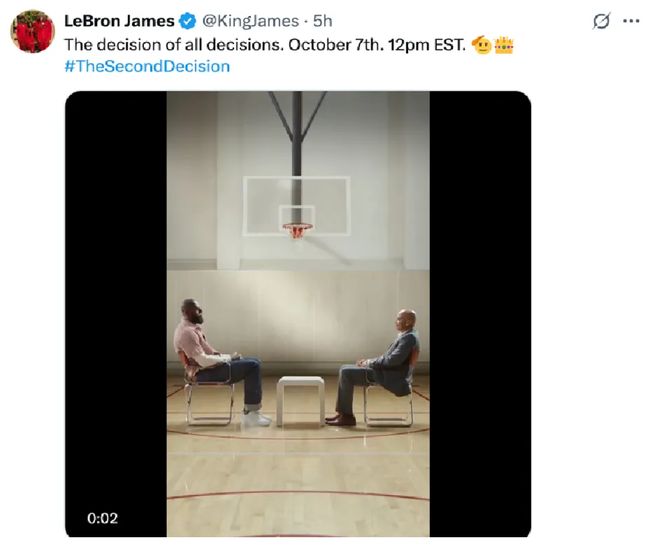需要注意的是,视频的最后显示的字样是“决定二”,而且詹姆斯穿上了跟2010年“决定一”时候的同款条纹衬衣。这就一下子引发了很高的关注度和讨论热情,大家都想知道,詹姆斯到底在决定些什么。在2010年,詹姆斯通过视频直播的方式公布了“决定一”,他要离开克利夫兰骑士队,加盟迈阿密热火队。转眼15年过去了,詹姆斯已经辗转热火队,回到骑士队,又去了湖人队,再拿了