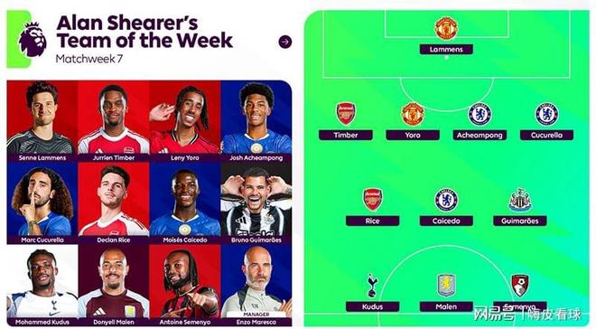 著名数据统计网站WhoScored根据上轮的球员评分,罗列了每个位置的最高分球员。力助曼联获得新赛季首场零封的拉门斯,以及连续两场比赛都有进球谢什科,成为门将和前锋的入围球员,跟热刺一样,都有两名球员入选。谢什科和特尔,能够力压进球停不了的哈兰德,都是不容易的。传奇球星希勒,在英超官网发表了自己的看法,也罗列了自己心目中的11人。不同的是,希勒比较青睐击败了利物浦的切尔西,以及重登榜首的阿森纳,两队贡献了5名中后场球员。不过,曼联还是有两名球员,拉门斯依然是其中之一,约罗替换了谢什科。