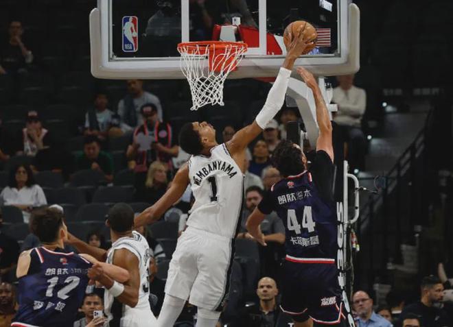 马刺今年首场季前赛对阵的是来自CBA联赛的广州龙狮男篮,当时文班亚马牛刀小试,拿到9分10篮板7助攻3封盖就下场休息了。陈国豪拿到了14分3篮板,彼时有球迷开玩笑说“文班亚马不如陈国豪,得分都没上双”。