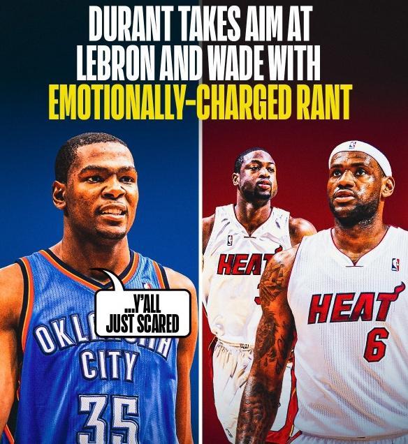 杜兰特认为当时詹姆斯和韦德这些人恭喜哈登去火箭能大杀四方,是因为他们害怕我们(雷霆三少)即将统治