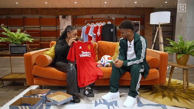 对,2021年的那场比赛。说说那次首秀吧,穿着这件漂亮的球衣走上球场,是怎样的感觉?紧张吗?当然有点紧张。为曼联踢球是我的梦想。我刚来时只有 18 岁,没有任何一线队经验。能代表曼联出场,对我来说意义太大了。不过那时也有点压力,因为我不太确定自己能踢得怎么样。上场之后感觉如何?是不是比想象中更放松?是的。上场后感觉很好,慢慢就放松了,虽然当时经验不多,但很享受那个过程。现在每次再穿上这件球衣,还会有那种压力吗?会的。这个队徽对我来说意义重大。我很喜欢你看着队徽微笑的样子,这些回忆真的很特别。从当年到现在,你确实走了很远。是的,没错。现在能留在曼彻斯特,是因为我一直在努力。我会继续努力,希望能在这里待很久。我们再看另一件球衣。这件你一定熟悉——你在对利物浦的比赛中打进制胜球。那场比赛对你来说意味着什么?那一刻对我来说是职业生涯的重要一步。对利物浦打进制胜球,对我来说意义非凡。但那场比赛对球队的意义更大,因为那时球队正经历困难,我们非常需要那场胜利。那一刻的感觉太疯狂了,之后还能和家人一起庆祝,我真的很开心。