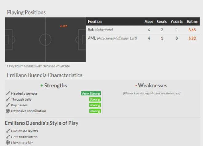 不只是维拉的先发11人,布恩迪亚也有可能成为胜负手。这名阿根廷中场在之前的一波4场英超和欧战赛事中,贡献了3球1助攻。要知道这3场比赛,他只有1次先发出战,尤其是与富勒姆的比赛里,替补出场的布恩迪亚传射建功,成为球队赢球的头号功臣。