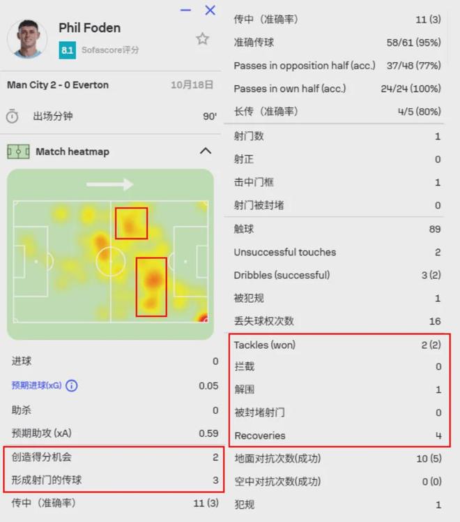 跟哈兰德的数据爆表相比,福登的进球和助攻数都不显眼,不过他本赛季的作用却是很大。以上一轮与埃弗顿的英超联赛为例,虽然没有收获助攻,但是福登送出3次关键传球,创造2次绝佳得分机会,3次过人尝试成功2次。在球场上覆盖面积很大的他,还有2次成功抢断(抢断成功率100%)、1次解围和4次夺回球权。福登的价值在于他有着不错的脚下能力,同时还有着很强的跑动能力。上一场面对埃弗顿时哈兰德的第二个进球,就是来自福登拿球传禁区后点发起进攻,同时他又无球移动,先哈兰德一步进禁区,带走防守人注意力。也是因为这个原因,最终带来了哈兰德在倒三角位置的射门得分,福登的作用往往就体现在这些细节中。