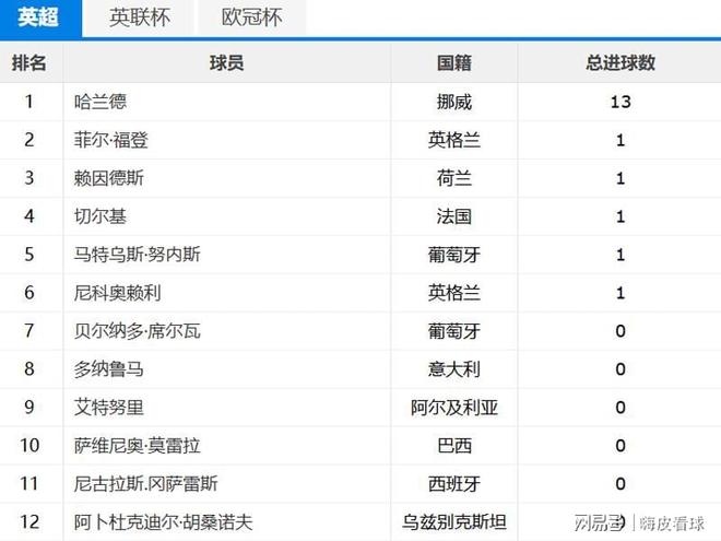 曼城的队内射手榜,哈兰德一共打进13球,随后的5名队友,都只有1个进球,一共只有6人能够进球,哈兰德足足是第二名的13倍,这个数字实在太可怕了!有些球迷可能发现了,曼城不是打进20球吗,还有2球是属于谁的呢?原来,曼城大胜升班马伯恩利的比赛中,对方后卫埃斯特夫,一人贡献两个乌龙球,从某种意义上来看,埃斯特夫才是曼城的二号射手。显然,曼城的进球高度集中在哈兰德一个人身上,的确,超级中锋就应该有这样的表现,不仅是曼城,挪威也受益于哈兰德源源不断的进球。最近两场欧洲区预选赛,哈兰德分别打进4球和5球,两场比赛轰进9球,让净胜球落后16球的意大利,陷入彻底绝望中。因此,只要哈兰德不能进球,曼城就没有太多办法,遭遇了两场失利。