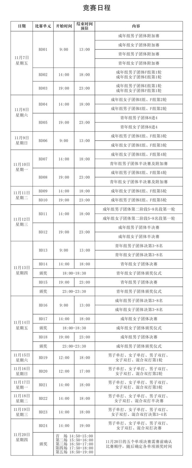 全运会最大的特点就是团体赛和单项赛相连,其强度也对球员的续航能力提出很高的要求,尤其是那些团体赛打到决赛,马上又转战单项赛的,在单项赛兼项出战的球员压力会倍增。根据赛程,成年组男团和女团金牌将在11月14日决出,而单项赛将在11月15日随即进行,五个单项冠军将在11月20日决出。