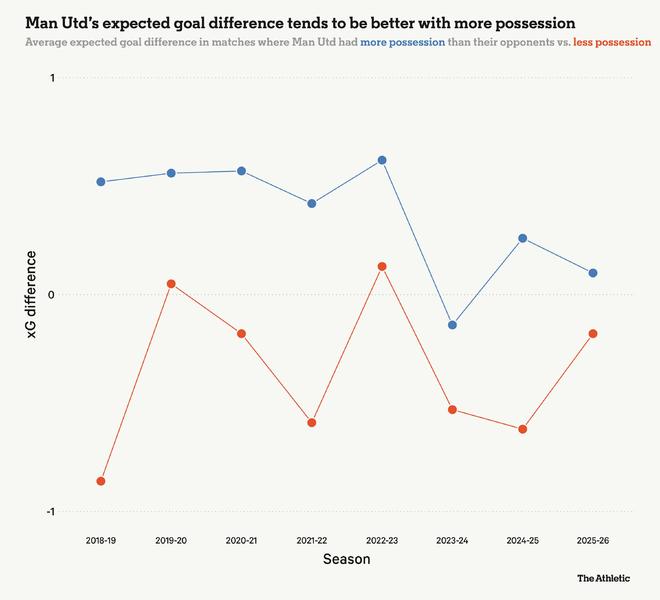 阿莫林似乎更倾向于让曼联以最高效的方式先取得进球,再从此刻起控制比赛节奏。“如果你需要一脚传球,就把球传进去,因为球迷想看到不一样的比赛。”他说。“我们在英格兰。我过去曾试图向你们展示一点英式足球的味道。就是这样。我并没有一个固定的组织进攻方式。我只是观察空间、球员数量、我方球员的特点,并尝试利用这些来赢得比赛。”这与曼联的控球数据有何关联?对阿莫林而言,领先的球队通常是控制比赛的一方。而曼联进球的最佳方式,就是采用适合其最佳球员的打法。球队新签下的锋线三叉戟在转换进攻时刻都极具威胁,他们身后还有布鲁诺-费尔南德斯——一位尤其偏爱直塞球的组织核心。阿莫林提到的“人数博弈”,指的是球队在进攻时会在各个区域寻找人数优势。如果能让核心球员形成三对二或二对一的局面,球队的指导思想就是快速直接地将球推进到前场。曼联上个月对阵利物浦时的开场进球就是一个很好的例子。双方几次头球争顶后,最终由费尔南德斯拿到了第二落点。曼联队长随即发现了左后卫凯尔凯兹身后的空当,迅速将球传给插上的右翼卫阿马德-迪亚洛。阿马德接球后传给姆伯莫,曼联在比赛开始两分钟后就取得领先,整个过程没有多余的跑动,从后场到前场效率极高。在考虑曼联的控球率与他们赢球或甚至平局能力之间的联系时,比赛状态很重要。对阿莫林来说,在安菲尔德取得1-0领先后,试图掌控皮球几乎没有意义。相反,他们寻求紧凑防守,而斯洛特的球队则为了扳平比分而进一步压上。利物浦压得越靠上,身后留给曼联直接攻击的空间就越大。2025-26赛季,曼联在控球率较低时的预期进球值(xG)和预期失球值略差一些,如下方的图表所示。但只要他的球队能控制对手射门的来源(即:来自远射或边路),并且己队能创造出不错的机会,这对主教练来说似乎并不是一个迫在眉睫的担忧。