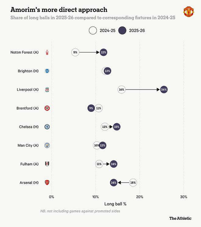 如果观察本赛季球队长传球的百分比,并与2024-25赛季相应的比赛数据相比,几乎每场比赛都有所提升。无论在老特拉福德主场还是客场作战,这种打法也始终如一。在2-2 战平森林后,阿莫林表示他认为球队在主场的活力更足。但这种提升的锐利度并没有让他的球队在主场刻意追求更多控球权。曼联球迷以前不是见过这种打法吗?在某种程度上,是的。穆里尼奥、索尔斯克亚和滕哈格都曾通过专注于转换进攻在曼联取得过一些成功。后者甚至在2023-24赛季前宣称,他打算将俱乐部变成“世界上最好的转换进攻球队”。阿莫林很可能基于与其前任们相似的原因得出这一结论:1. 这种打法适合队中大多数核心球员的特点。2. 事实证明,这种打法在对阵曼城、利物浦等强队时有效。3. 这种风格让人回想起俱乐部此前的黄金时代,也能让球迷看得过瘾。而这些前任教练们在破解深度防守时不是都遇到过问题吗?不幸的是,确实如此。这三人都曾尝试整合高价引进的球员,以期让他们的曼联队在面对深度防守时拥有额外优势。三人所构建的球队通常擅长快速进攻并冲击防线身后的空间,但在对付那些收缩防守、不允许这种空间存在的球队时,则显得办法不多。正如我们此前解释过的,这是阿莫林早在执教他的首场英超比赛之前就长期意识到的问题。终会有一个时刻,他的球队需要学会如何掌控球权并击败那些试图消耗他们耐心的球队。本赛季他已经多次解释,他的球队不应总是追求快速出球。在1-1战平富勒姆后,他说:“当我们进球后,我们就忘记了应该保持的比赛方式。”“我们满脑子只想着保住比分。我们太想赢了,以至于忘了要保持控球权,试着把对手压得更深。我们就这样把一部分比赛主动权交给了富勒姆。”对阿莫林来说,快速不等于愚蠢,迅捷绝不能沦为草率。在整个比赛过程中,必须对球进行积极、有意图的利用。在整个赛季中,保持适当的防守结构将是这种风格的关键。曼联在长传进攻时表现不错,但在防守长传时也显得脆弱(这是阿莫林上任前就长期存在的另一个问题)。接下来可能发生什么?曼联会先改进A计划——即直接打法——然后最终引入B计划:学会有效掌控球权。阿莫林的曼联在本赛季剩余时间里很可能是一支体面的球队。他们正在进步,同时他们的夏季新援也正很好地适应老特拉福德的生活。曼联目前以四场不败保持着联赛第二长的不败纪录,并且他们的赛程安排应该能让他们以稳定的速率继续拿分。利桑德罗-马丁内斯恢复全面健康也将帮助曼联赢得比赛,并让他们在拥有更多控球权时感到更舒适。这位阿根廷中后卫是一名凶悍的抢断者和出色的后场推进传球手,能为球队提供更多控制比赛和丰富打法的手段。“寻找可用空当,并在可能的地方争取人数优势”这种方法——在某种程度上——对阿莫林的前任们起过作用。如果本赛季被视为重建的第一部分,那么使用球员们熟悉且过去曾取得成功的方法是有其价值的。前方还将有更多的挑战——尤其是在下个月姆伯莫、阿马德和马兹拉维分别离队参加非洲国家杯期间——但曼联正越来越接近发挥出他们阵容纸面实力的水平。赢球的方式不止一种。阿莫林有充分的理由避免为了传球而传球。【上咪咕独家看英超】相关资讯
