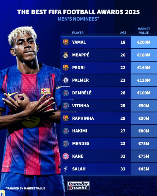 北京时间11月7日,国际足联官方公布了2025FIFA年度最佳球员候选,登贝莱、亚马尔、姆巴佩、凯恩等球员在列。德国《转会市场》给出了这11名球员的身价排行:亚马尔以2亿欧稳居榜首,在他身后的第二名是皇马的姆巴佩,身价1.8亿欧,第三名是巴萨中场佩德里,第四名是切尔西中场帕尔默。榜尾是两名老将,其身价主要受到了年龄的影响,33岁的萨拉赫以4500万欧名列第11,32岁的凯恩以7500万欧名列第10。不出人们所料的,巴黎在这11人中占据了4席居首,分别是已经斩获了金球奖的登贝莱,以及中场维蒂尼亚,和两翼阿什拉夫、努诺-门德斯。第二名巴萨有3人入选,分别是亚马尔、佩德里和拉菲尼亚。英超只有2人入围,帕尔默率领切尔西拿到了世俱杯,萨拉赫则是上赛季当之无愧的英超第一人。相关资讯