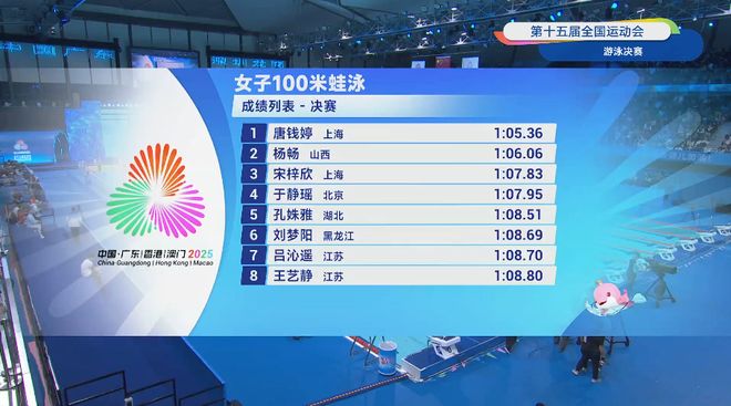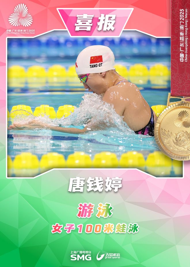 北京时间11月12日,第十五届全运会游泳项目迎来女子100米蛙泳决赛的较量。最终,该项目世锦赛冠军、巴黎奥运会亚军得主,上海队运动员唐钱婷以1分05秒36的成绩第一个触壁,为上海队再添一枚金牌!同时,获得生涯首枚全运会个人项目金牌。另一位上海选手宋梓欣以1分07秒83获得第三名,拿到铜牌!