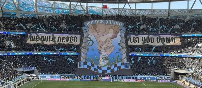 如果问在整个中国足球里,哪支球队最擅长用TIFO表达球队精气神,大连队无疑是中超独一档的存在。天蓝色与黑色相连接的TIFO,横摆在巨大的看台之上,尽管大连的球队曾经有着豪门冠军荣耀,但后来一度跌跌撞撞,在中甲中乙徘徊,近几个赛季才重新杀回中超,“WE ARE DALIAN”的巨大横幅,彰显了球迷对大连这座足球城市的无限热爱。