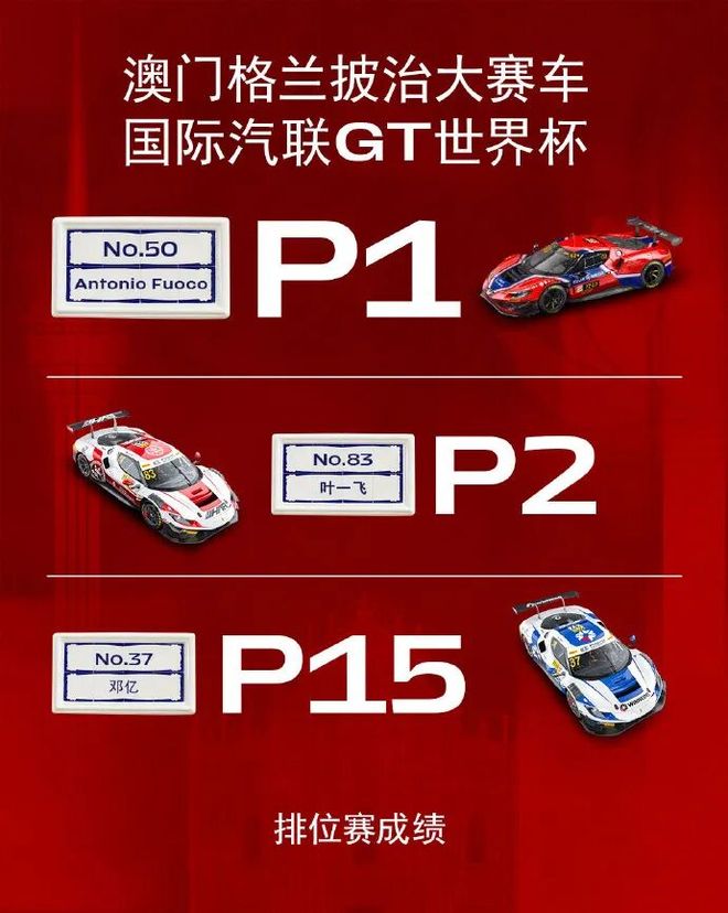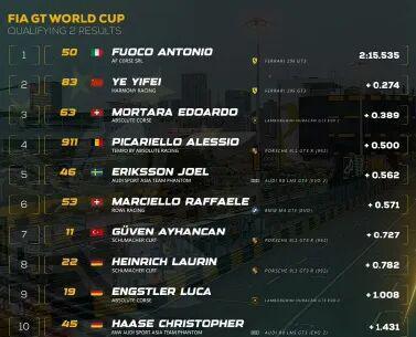 在GT世界杯排位赛中,两辆法拉利的表现也非常出色,Antonio Fuoco和叶一飞包揽前两名,实现了两台法拉利296 GT3在世界杯选拔赛中头排发车的盛况。