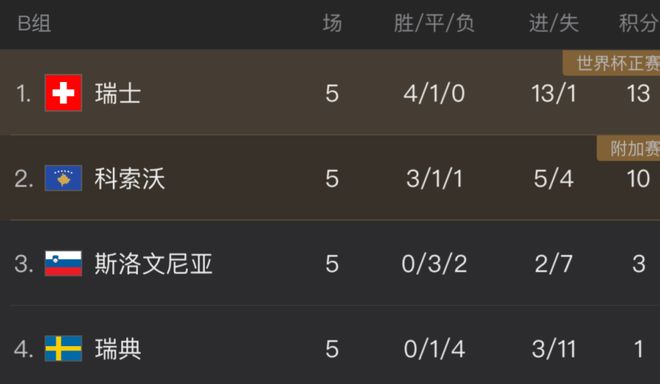 本轮溃败后,瑞典5轮仅积1分排名垫底。作为一支总身价高达5.16亿欧,拥有伊萨克、哲凯赖什、埃兰加等英超球星坐镇的欧洲劲旅,世预赛却一胜难求,只进了3球却丢了11球。