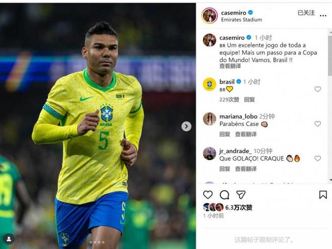卡塞米罗社媒晒出比赛照片,写道:“全队都表现出色,向世界杯又迈进一步!加油巴西!”消息来源:卡塞米罗社媒2 - 埃斯特旺实在太出色巴西队在一场友谊赛2-0击败塞内加尔,效力于切尔西的小将埃斯特旺首开记录,卡塞米罗锁定胜局。