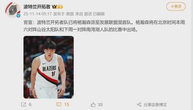 随后,5日,据开拓者官方消息,球队已将杨瀚森下放到G联赛(