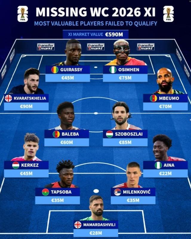 11月19日讯 德转社媒晒图,列出无缘2026世界杯球员中身价最高的首发阵容,奥斯梅恩、姆伯莫、K77、索博斯洛伊等多名球星在列。无缘世界杯身价最贵阵(单位:欧元)前锋:克瓦拉茨赫利亚(格鲁吉亚、9000万)、吉拉西(几内亚、4500万)、奥斯梅恩(尼日利亚、7500万)、姆伯莫(喀麦隆、7000万)中场:巴莱巴(喀麦隆、6000万)、索博斯洛伊(匈牙利、8500万)后卫:凯尔凯兹(匈牙利、4500万)、塔普索巴(布基纳法索 、3500万)、米伦科维奇(塞尔维亚、3500万)、艾纳(尼日利亚、2200万)门将:马马尔达什维利(格鲁吉亚、2800万)买断费仅需3千万!拉什福德本赛季已6次助攻是五大联赛同期最多