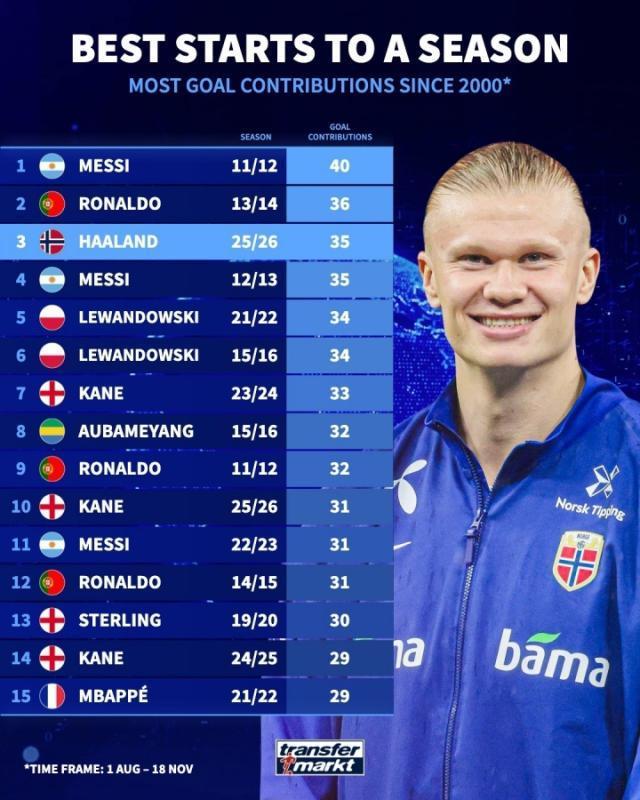 11月20日讯 德转统计了本世纪赛季开局的进球贡献数,哈兰德以35粒进球位居历史第三,仅次于梅西和C罗。本世纪赛季最佳开局进球贡献数:(8月1日-11月18日)1、梅西 11/12赛季 40球2、C罗 13/14赛季 36球3、哈兰德 25/26赛季 35球4、梅西 12/13赛季 35球5、莱万 21/22赛季 34球今日(11.21)08:00 NBA常规赛 快船 - 魔术09:00 NBA常规赛 国王 - 灰熊09:00 NBA常规赛 76人 - 雄鹿09:00 NBA常规赛 老鹰 - 马刺20:30 U17世界杯1/4决赛 奥地利U17 - 日本U1721:30 U17世界杯1/4决赛 意大利U17 - 布基纳法索U1722:45 U17世界杯1/4决赛 葡萄牙U17 - 瑞士U1723:15 沙特联第9轮 吉达联合 - 利雅得体育23:45 U17世界杯1/4决赛 摩洛哥 U17 - 巴西U17明晨(11.22)01:30 沙特联第9轮 吉达国民 - 胡拜尔库迪西亚03:30 德甲第11轮 美因茨 - 霍芬海姆03:45 法甲第13轮 尼斯 - 马赛04:00 西甲第13轮 瓦伦西亚 - 莱万特04:30 葡杯第4轮 葡萄牙竞技 - 本菲卡相关资讯