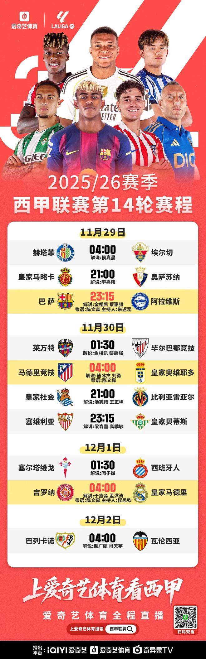 巴塞罗那vs阿拉维斯 11月29日(周六)23:15本周六夜间西甲第14轮,巴萨坐镇主场对阵阿拉维斯,由于皇马要稍晚一天比赛,因此巴萨赢球即可暂时登顶。本场比赛,爱奇艺体育将全程直播。上轮联赛,巴萨自2023年5月以来首次重返诺坎普作战,以4-0横扫毕尔巴鄂竞技,与榜首皇马之间的差距缩小到了1分。周中欧冠,巴萨远征切尔西落败,三天后还将迎击强敌马竞,球队需要在状态分配上格外留意。阿拉维斯上周0-1不敌塞尔塔,遭遇两连败,目前位列西甲第14名。历史战绩方面,巴萨面对阿拉维斯占据极大优势,近16次交手取得14胜2平的不败战绩,上次失利还是2016年。上赛季巴萨对阿拉维斯完成零封双杀,莱万包揽两回合全部的4粒进球,本场他或将再次有所表现。亚马尔本赛季9次西甲出场参与10球,同样有望成为进攻端的制胜关键。阵容上,巴萨近期迎来一批伤员回归。拉菲尼亚从肌肉受伤中康复,连续两场比赛替补登场,正在找回状态;对切尔西一役,上轮因病缺席的拉什福德也重新现身。据消息,佩德里将在本周末返回赛场,届时队内将仅剩加维与特尔施特根两名长期伤员,这对巴萨一洗欧冠失利颓势,乃至冲击西甲榜首都是极大利好。马德里竞技vs皇家奥维耶多 11月30日(周日)04:00本周日凌晨,马竞将迎来副班长皇家奥维耶多的挑战。上轮联赛中,马竞1-0险胜赫塔菲,联赛5连胜,排名稳定在西甲第4,与身前的比利亚雷亚尔有1分差距。周中欧冠,马竞凭借希门尼斯的绝杀主场2-1轻取国米。今年夏天,奥维耶多时隔24年重返顶级联赛,升级后成绩并不理想,13轮仅取2胜,目前位列积分榜倒数第一。两队近期的交锋记录并不多。22/23赛季国王杯中,马竞曾2-0淘汰这一对手。在西蒙尼的率领下,马竞坐拥西甲最出色的防线之一,11粒丢球与黄潜并列最少。另一方面,奥维耶多13轮仅打入7粒进球,是联赛中唯一进球数仍未上双的球队,面对进攻乏力的对手,马竞唯一的目标是零封取胜。人员方面,奥布拉克在本月国际比赛日期间受伤,连续缺席名单,近两场首发门将由穆索出任。对阵国米赛前,奥布拉克已经恢复合练,本周末有望复出。
