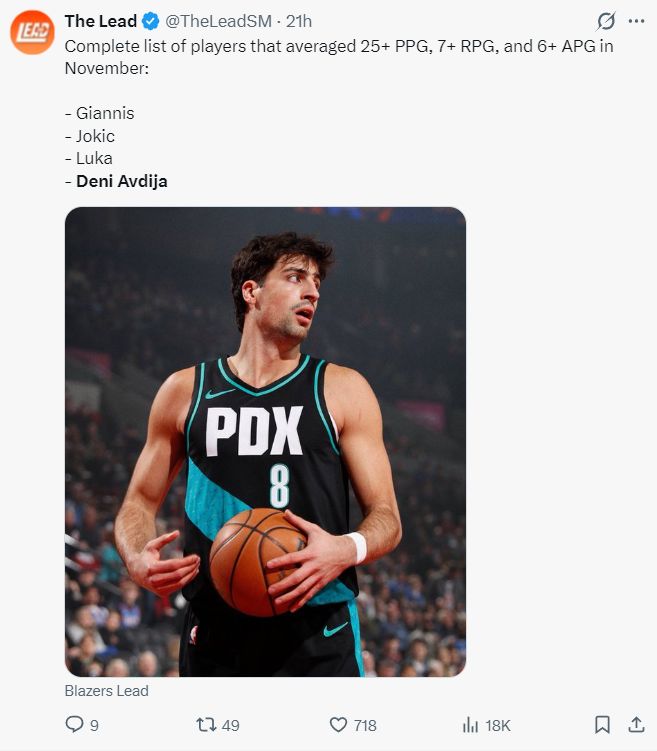 阿夫迪亚本赛季的数据大幅提升,开拓者媒体力挺他入选全明星+拿到MIP(最快进步球员)。他本赛季场均34.1分钟,拿到25.8分7.1篮板5.8助攻0.6抢断0.7盖帽,命中率47.6%,三分命中率37.8%。得分、登场时间、助攻、出手数、运动战进球数、三分出手数、场均三分命中数、盖帽、罚球、罚球命中数都是生涯新高。