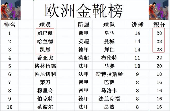 欧洲金靴榜方面,凯恩和哈兰德本轮都没有进球,姆巴佩则是打入一粒点球,这样的话姆巴佩就追上哈兰德和凯恩,三人28分并列第1。蒂亚戈22分排在第4,曼联旧将格林伍德20分排在第5。莱万,穆里奇,伯克特和莱波尔16分刚好挤入前十。前十当中五大联赛只有意甲无人进入,另外意甲也是唯一没有球员进球上双的,要不是劳塔罗本轮怒破5球“大关”,金靴榜前20都没有意甲球员。相关资讯