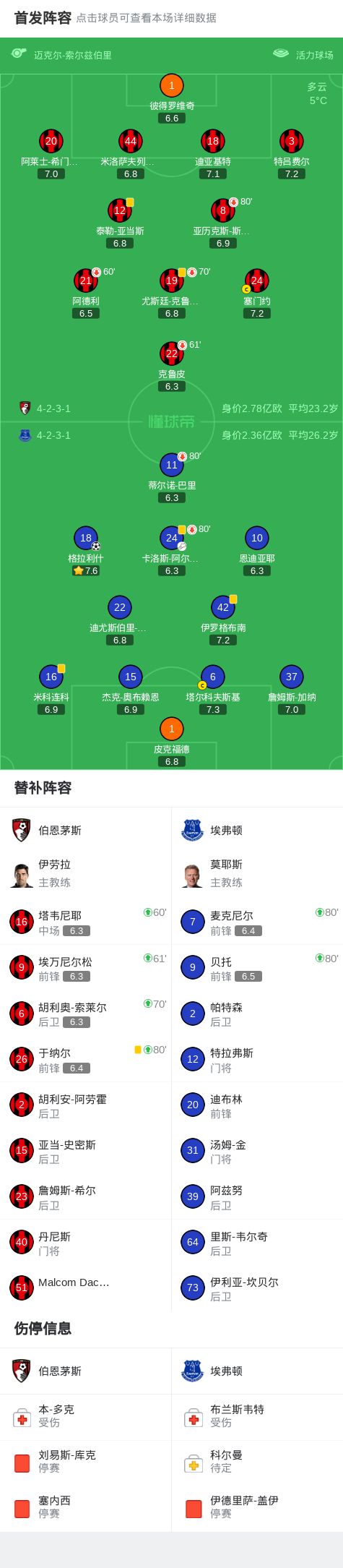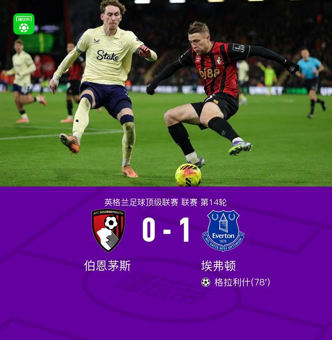北京时间12月3日,2023-2024赛季英格兰足球超级联赛第14轮,伯恩茅斯主场迎战埃弗顿。上半场,克鲁皮破门因越位在先被吹。下半场,格拉利什射门,击中后卫折射入网。全场比赛结束,埃弗顿客场1-0击败伯恩茅斯。关键事件第80分钟,格拉利什射门,皮球击中后卫折射入网,埃弗顿1-0