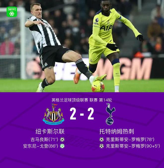 北京时间12月3日英格兰足球顶级联赛 联赛 第14轮,纽卡斯尔联主场对阵托特纳姆热刺。纽卡斯尔联吉马良斯破门,安东尼-戈登破门。托特纳姆热刺克里斯蒂安-罗梅罗梅开二度。最终比分纽卡斯尔联 2-2 热刺。关键事件