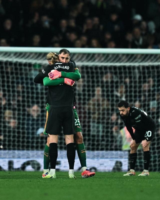 然而在瓜帅换人之前,曼城就已经丢掉了第二球,尽管伊沃比的射门地点要比后面两球远上不少。富勒姆球员身前还是一片空旷地,距离皮球最近的“补防”球员还是攻击型的福登。对于一支想要争冠的球队来说,如此场面反复出现是极为不合理的,主帅的部署肯定有问题,人员也让人难以放心。目前腿部肌肉有问题的罗德里仍旧在恢复阶段,接受了跟腱手术的科瓦契奇更是要明年2、3月才能复出,连续一周双赛单靠尼科一个正经后腰硬抗肯定难熬。此前瓜帅已经试过用赖因德斯拖后,效果非常差,本场想倚仗B席控场外加“堆后卫”耗耗时间似乎也不太行。除了一直比较危险的后腰位置,原本以为特别稳妥的门将此役也让人大跌眼镜。都说选择唐纳鲁马是瓜迪奥拉向现实低头,不再强求守门员脚下出球,只要力保门前安全就好,但本场唐纳鲁马却丢了4球,只做出1次成功扑救,直接让自己的扑救成功率跌到58%英超倒数第三,仅高于利物浦的阿利松(56%)和曼联的巴延德尔(54%)。当然我们也可以认为唐纳鲁马是运气不好,毕竟富勒姆全场只有0.91的预期进球值,射门却次次威力无穷,不是奔向死角就是有如出膛炮弹般又快又狠。但这位意大利门神最近确实也有点处在舆论漩涡的感觉:一是上周末“诈伤”为瓜迪奥拉赢得场边加课的时间,引来利兹主帅法尔克的抨击;二是身为门将,前10次英超出场就拿到黄牌4张,距离累积黄牌停赛只差一步之遥。对富勒姆赛前,瓜迪奥拉曾表示唐纳鲁马是成年人,无需私下交代他注意黄牌问题,但如今单场丢4球,曼城主帅是不是也该专门提点一番?唐纳鲁马本人则有点逃过一劫的感觉,赛后他于社交媒体放出一张自己拥抱哈兰德的照片,并附文:“你们跟我说过英超很疯狂,是吧!”还配了个尬笑流汗的表情。仿佛在说:还好有哈兰德!不然我就完了!