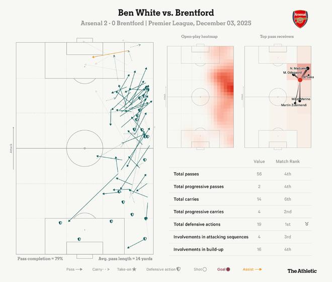 随着克里斯蒂安-莫斯克拉在上半场受伤,使他加入萨利巴和加布里埃尔的伤病名单,这种“需要他”的现实更加明显。廷贝尔替补登场去踢中卫,而阿尔特塔显然不想打破怀特与马杜埃凯在右路形成的良好配合。考虑到周六对阵阿斯顿维拉的快速节奏,他可能需要这对右路组合继续作为后防线的一部分。不过,在为即将到来的密集赛程做准备时,阿尔特塔在怀特的助攻之外,还看到了一些令人鼓舞的细节。这位28岁的球员在进入禁区后能轻松用一脚或两脚处理球,不管是传中还是反向把球分给队友。比赛初段,他在阿森纳控球时经常来到更中间的位置,这与他此前的使用方式略有不同,也让马杜埃凯在边路获得更多空间。但最重要的是,怀特重新展现了他在对抗中的强度。在过去10个赛季的英超中,他是阿森纳唯一一个在单场比赛中完成至少6次抢断和6次解围的球员。当被问及怀特在进攻端的贡献时,阿尔特塔特别强调了他在防守端的表现。阿森纳主帅表示:“首先,后卫就是要防守,要带着那种目的性、决心和效率去防守。他今天做到了。然后如果他能在控球方面继续给球队增加价值,比如传球、跑动和传中,那更好。我认为他今天在这两方面都做得非常好。”在为阿森纳效力的前三个赛季里,本-怀特每季都接近打满3000分钟,但膝盖手术让他上赛季的总出场时间只有1198分钟(13次首发)。本赛季已有9名阿森纳球员的出场时间超过他,但现在可能轮到怀特再次提醒所有人,他过去(并且现在仍然)在阿尔特塔体系里的关键作用。在上个月北伦敦德比前被问及怀特时,阿尔特塔说这位右后卫“需要在上场时通过表现来做到这一点,就像其他球员一样。”怀特在对阵布伦特福德时确实做到了,他帮助阿森纳继续保持对第二名曼城5分的领先优势。而接下来挑战是,在节日期间密集的赛程里,他要每周至少两次完成这样的表现。【上咪咕独家看英超】相关资讯