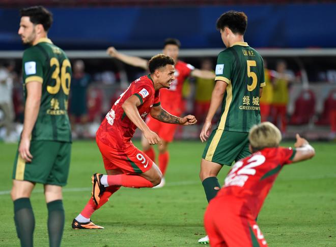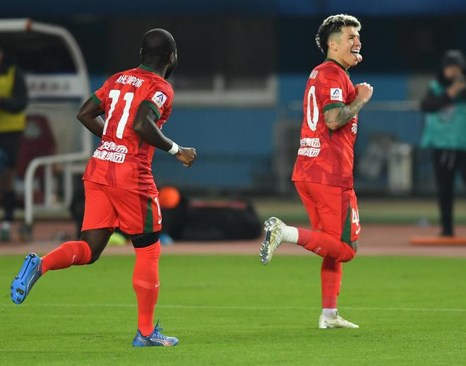 ↑6月22日,河南队球员费利佩·卡多索(中)在比赛中庆祝进球。新华社记者 李嘉南 摄第五轮面对上海申花队两队加时打成3:3点球大战十轮战至8:7河南客场爆冷晋级半决赛又是客场河南与成都蓉城互交白卷点球大战河南4:3胜出