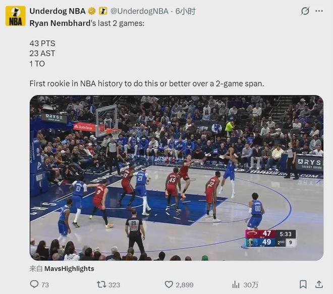 如果是状元弗拉格打出这种数据,独行侠球迷不会惊讶。但内姆哈德只是个落选秀,今年夏天,独行侠给了他一份双向合同,年薪63.6万美元。最近4场内姆哈德才被提上首发。此前6场比赛,他场均出战10.3分钟,仅得3分2.6助攻。