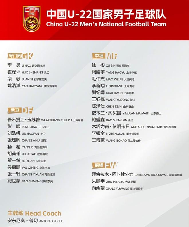 看来,安东尼奥认为前锋有拜合拉木、朱鹏宇、向余望够用了,而且王博豪上次客串效果不错,所以弃用刘诚宇。但只有拜合拉木冲击力强,朱鹏宇和向余望冲击力不如刘诚宇,当然也各有特点。汪士钦、玄智健落选,左边路有点悬。难道让胡荷韬打回左边路?吴启鹏、鲍世蒙也能打。按规定,U22国脚于2025年12月7日14:00前到广东省肇庆市报到。集训人员在集训和比赛期间的食宿、交通、保险等相关费用均由中国足协承担。【您若喜欢“刀锋体育”的文字,请果断关注,了解中国足球不迷路】相关资讯