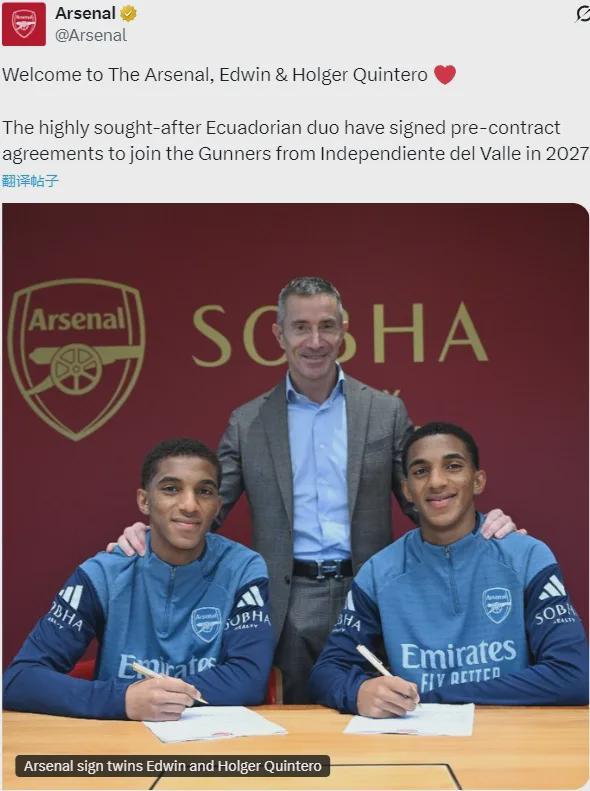 官方:阿森纳宣布和厄瓜多尔球队山谷独立就16岁双胞胎兄弟埃德温-金特罗和霍尔格-金特罗的转会达成了协议,2人将在2027年夏天年满18周岁后正式加盟。金特罗兄弟和因卡皮耶出生在厄瓜多尔的同一地区,并且都出自山谷独立队的青训,他们被认为是南美最令人激动的新星之一,并且已经是厄瓜多尔u17的成员,其中埃德温是一名左脚右边锋,而霍尔格是右脚攻击型中场。着实没想到这么快就官宣了,不像阿森纳的风格,而且一般青年球员签约是阿森纳青年队的官推官宣,但这次直接用了官推!还有贝尔塔亲临,很有牌面!BBC说打包价900万英镑,很合适!期待住吧,2年后见!其实根据一些报道,阿森纳接下来不会再那么疯狂砸钱了,会投资年轻人,我觉得这也正常,而且健康,你不可能年年花两三亿……相关资讯