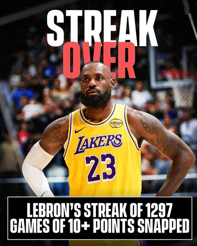 只说纪录终结这件事,实际上已经有了预期。上一场对阵太阳,詹姆斯三节结束只得到6分,第四节剩下6分钟前,一记后撤步三分才将得分提高到10分,由于当时湖人落后太多,有不少人质疑詹姆斯是为了延续纪录”刷分”。