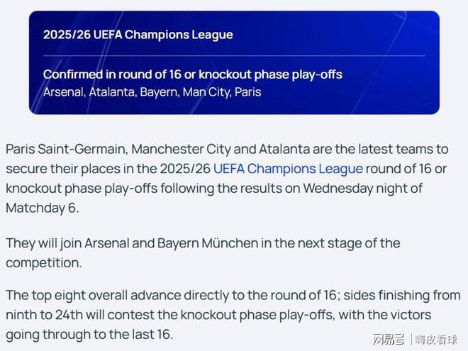 其余的比赛中,并没有太多的冷门,实力稍强的往往都可以笑到最后,比利亚雷亚尔主场负于哥本哈根,多特蒙德主场战平同样来自北欧的博德闪耀,巴黎圣日耳曼无法战胜毕尔巴鄂,也许是有些意外的结果。值得一提的是,穆里尼奥带领的本菲卡,连续击败阿贾克斯和那不勒斯,从倒数第二名上升到第25名,距离附加赛只有一步之遥。欧足联官网确认,5支球队已经锁定附加赛资格(前24名),包括榜首18分的阿森纳,15分的拜仁慕尼黑,以及巴黎圣日耳曼、曼城和亚特兰大,三支同积15分的球队。其中英超2队,德甲、法甲和意甲各1队,五大联赛独缺西甲。