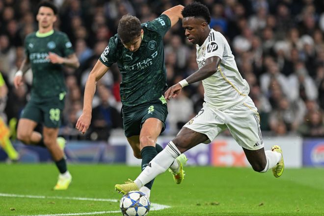 前场没了姆巴佩这尊大神,皇马运转的确流畅了许多。维尼修斯自不必多说,开场便身先士卒,险些为皇马赢得点球;罗德里戈一踢曼城就来劲,他甚至是皇马场上唯一状态和技术都优于对位对手的存在。第28分钟,罗德里戈接贝林厄姆的斜传突入禁区右肋后推射远角,多纳鲁马扑救不及,皮球弹地后滚入空门。