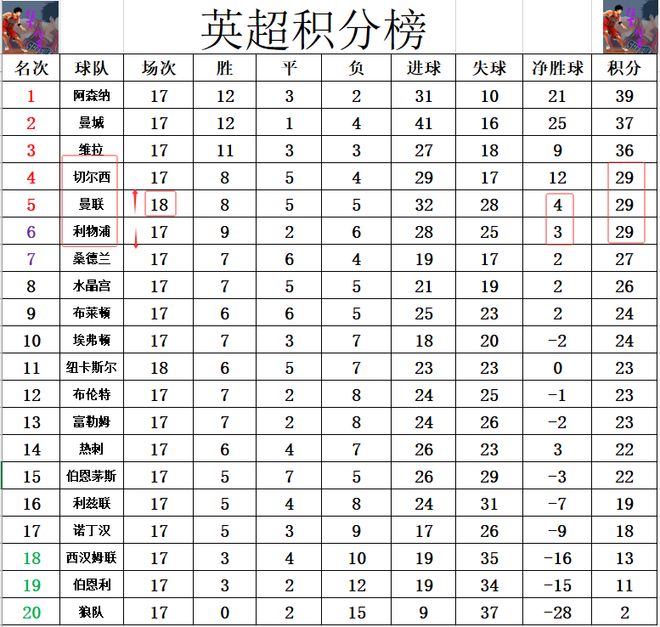 积分榜方面,英超现在形成了争冠和争4的两个阶队,阿森纳,曼城,维拉是争冠第一阶队,阿森纳多曼城2分,多维拉3分继续领跑。争4的第2阶队竞争更激烈,曼联今天小胜止住2轮不胜的颓势后,追上切尔西和利物浦,三队同积29分,曼联凭借1个净胜球的优势暂时超过利物浦升至第5。