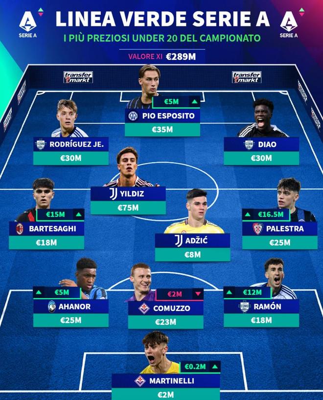 德转列意甲U20最佳11人阵容:门将托马索-马丁内利(佛罗伦萨)200万欧元(+20万)后卫哈科沃-拉蒙(科莫)1800万欧元(+1200万)、科穆佐(佛罗伦萨)2300万欧元(-200万)、阿哈诺尔(亚特兰大)2500万欧元(+500万)中场帕莱斯特拉(卡利亚里)2500万欧元(+1650万)、阿季奇(尤文图斯)800万欧元、伊尔迪兹(尤文图斯)6500万欧元、巴尔泰萨吉(AC米兰)1800万欧元(+1500万)前锋阿萨内-迪奥(科莫)3000万欧元、皮奥-埃斯波西托(国际米兰)3500万欧元(+500万)、赫苏斯-罗德里格斯(科莫)3000万欧元相关资讯