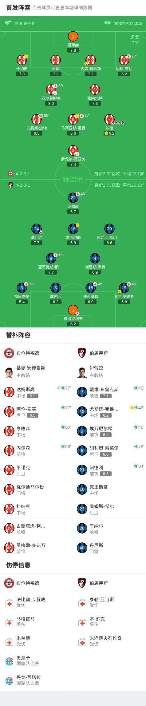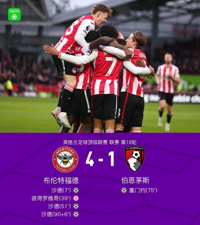 北京时间12月27日,英格兰足球超级联赛第18轮展开较量,布伦特福德坐镇主场迎战伯恩茅斯。比赛开局阶段,伊戈尔-蒂亚戈送出助攻,沙德破门为布伦特福德先拔头筹。此后,彼得罗维奇不慎将球打入自家球门,布伦特福德扩大领先优势。易边再战,亚尔莫柳克成功助攻,沙德再度建功,完成个人第二粒进球。随后塞门约为伯恩茅斯扳回一城。临近结束,达姆斯高送出关键助攻,沙德完成帽子戏法,锁定胜局。最终全场比赛结束,布伦特福德以4比1战胜伯恩茅斯。关键事件第7分钟,蒂亚戈直塞,沙德扛开防守低射破门,布伦特福德1-0伯恩茅斯