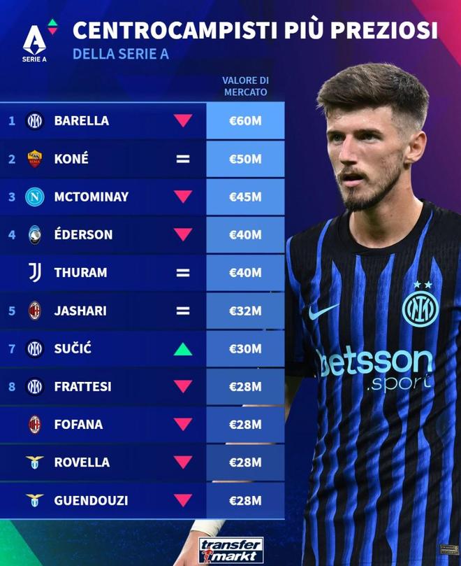 德转列意甲中场身价前10:1. 巴雷拉(国际米兰) 6000万欧元2. 夸迪奥-科内(罗马) 5000万欧元3. 麦克托米奈(那不勒斯) 4500万欧元4. 埃德松-席尔瓦(亚特兰大) 4000万欧元4. 凯夫伦-图拉姆(尤文图斯) 4000万欧元6. 亚沙里(AC米兰) 3200万欧元7. 苏契奇(国际米兰) 3000万欧元8. 弗拉泰西(国际米兰) 2800万欧元9. 优素福-福法纳(AC米兰) 2800万欧元9. 罗韦拉(拉齐奥) 2800万欧元9. 贡多齐(拉齐奥) 2800万欧元相关资讯