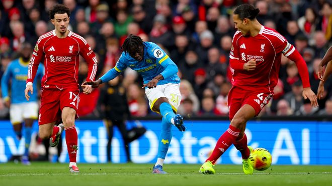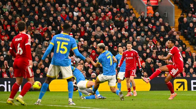 第26分钟,利物浦卷土重来,麦卡利斯特的劲射同样击中立柱,但裁判吹罚基耶萨在门前干扰了若泽萨,越位在先。直到第32分钟,狼队才完成第一次有威胁的射门,马内单枪匹马起脚远射,放了高射炮。