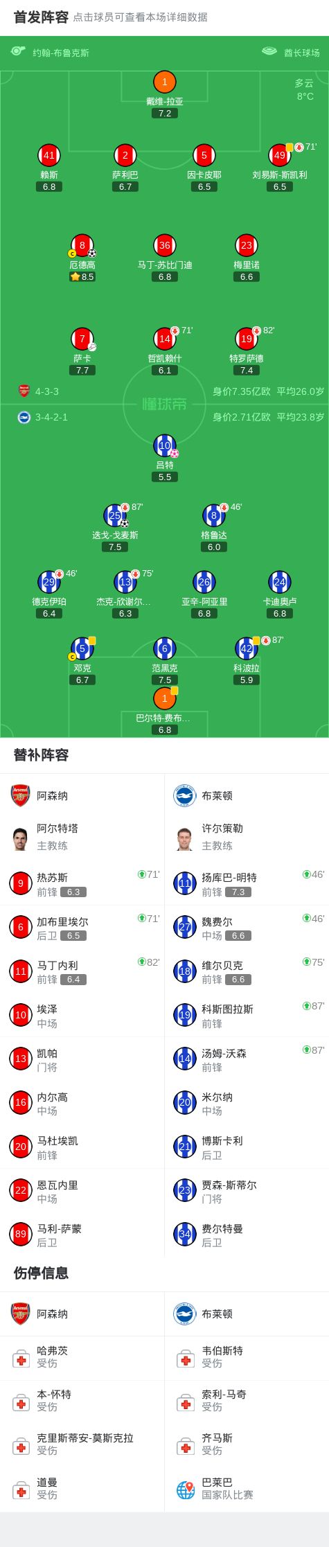 北京时间12月27日,英格兰足球顶级联赛第18轮展开较量,阿森纳坐镇主场迎战布莱顿。上半场萨卡助攻,厄德高远射攻入赛季首球。下半场赖斯角球造吕特头球乌龙,之后阿里亚抽射中柱,迭戈-戈麦斯补空门扳回一球,之后明特禁区内兜射,拉亚极限扑救。最终阿森纳2-1战胜布莱顿。关键事件第14分钟,萨卡助攻,厄德高远射攻入赛季首球,阿森纳1-0领先布莱顿!