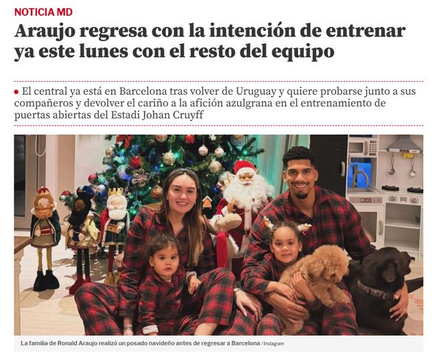 《世界体育报》指出,巴萨的圣诞假期结束,本周一,巴萨全队回归训练。阿劳霍也将回到约翰-克鲁伊夫球场,在6000名球迷面前参加训练。巴萨2026年的首战,将是1月3日的西甲第18轮,客场挑战西班牙人。不过,阿劳霍很可能赶不上这场西甲之战。《世界体育报》表示,阿劳霍希望逐步恢复身体、心理的双重受伤,直到感觉完全康复。