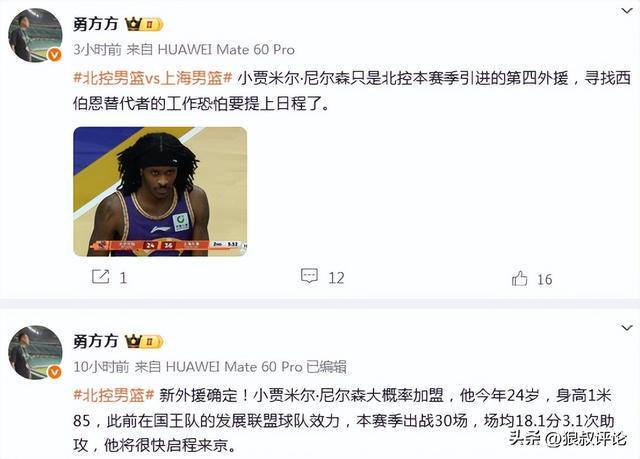 有消息称,北控男篮引进了小贾米尔·尼尔森,今年24岁,身高1米85,此前在国王队的发展联盟球队效力,本赛季出战30场,场均18.1分3.1次助攻,他将很快启程来京。北控男篮下一场将会对阵深圳男篮。相关资讯